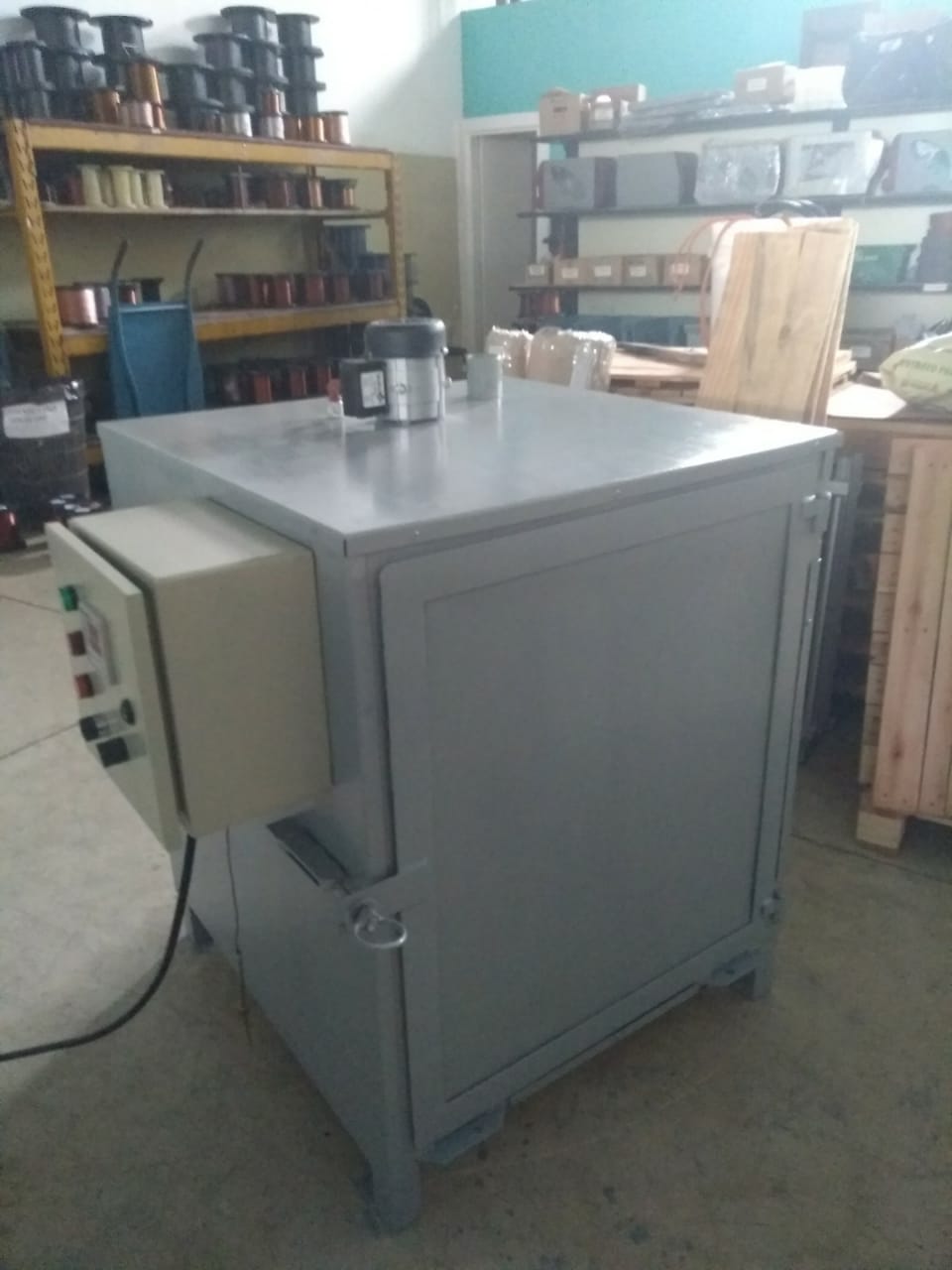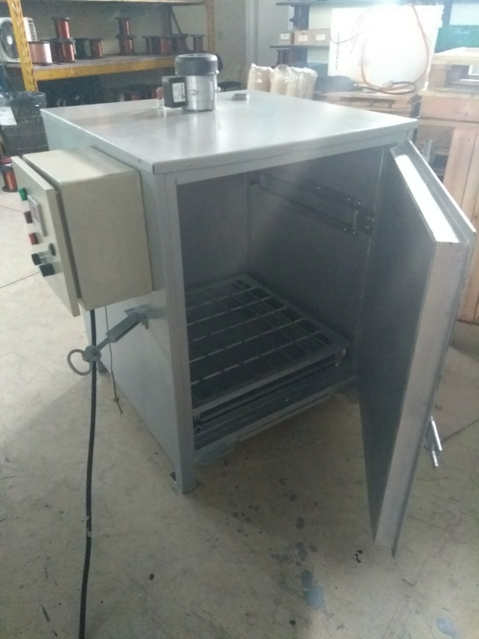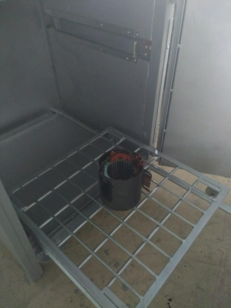 Estufa para secagem de motores elétricos até 200 kg ou 100 CVs temperatura mínima 15º e máxima 200º com controlador, ventilação forçada na parte superior e prateleira removível tipo carrinho.