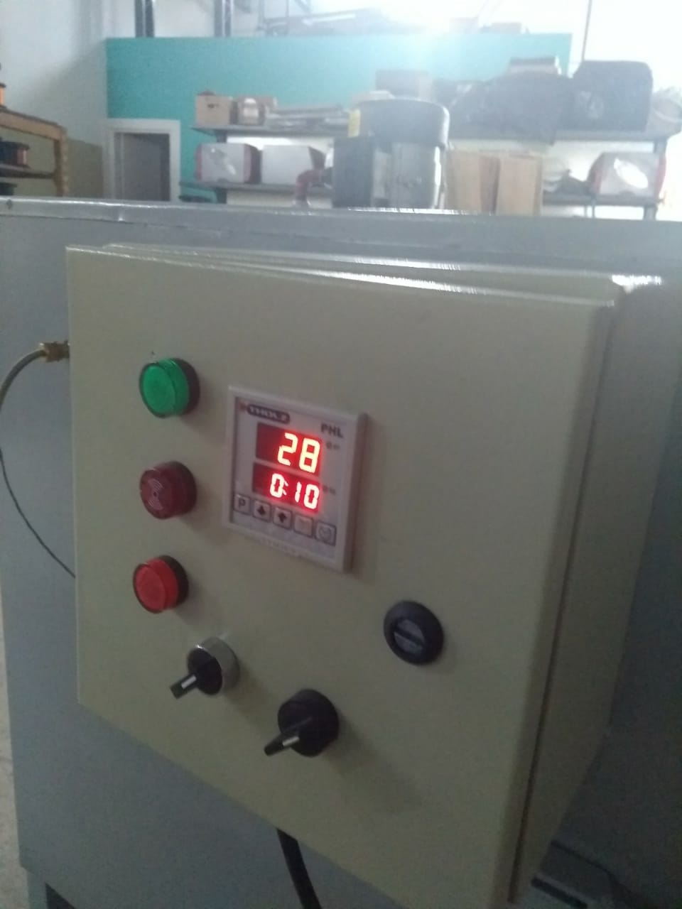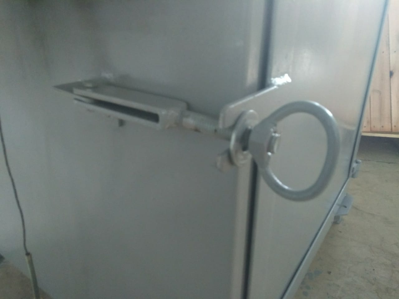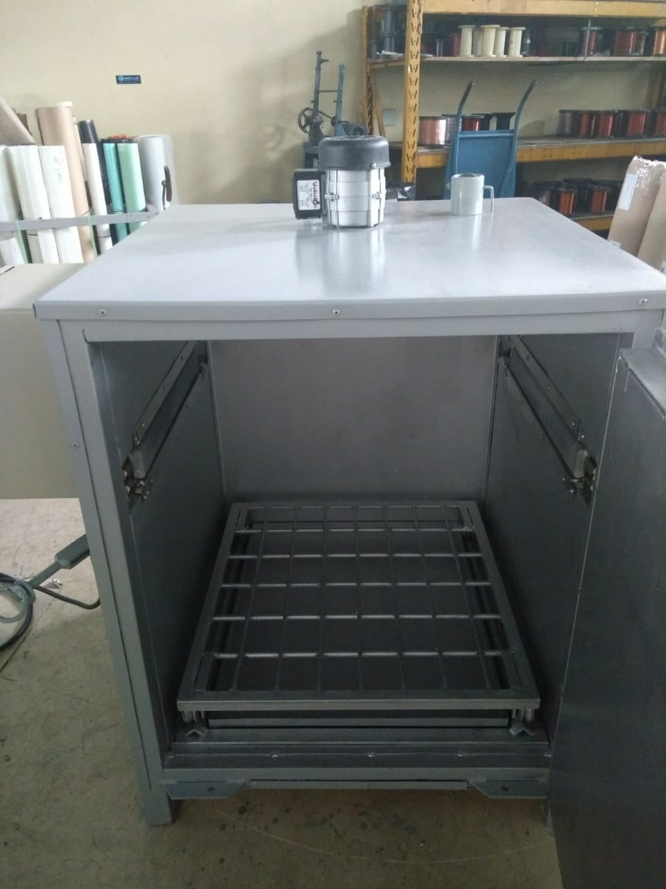 Estufa para secagem de motores elétricos até 200 kg ou 100 CVs temperatura mínima 15º e máxima 200º com controlador, ventilação forçada na parte superior e prateleira removível tipo carrinho.